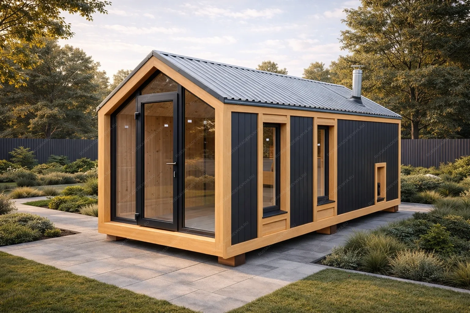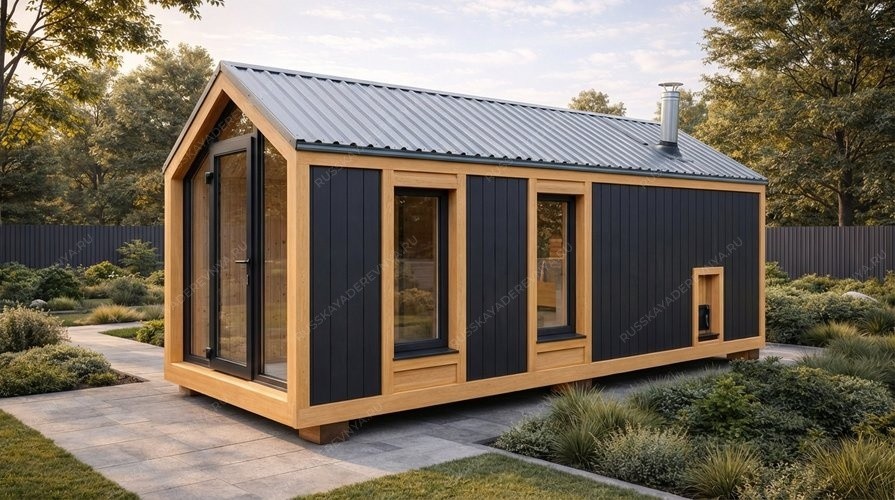 Мобильная баня «Росаль» в стиле барнхаус с габаритами 2,45x7 метров представляет собой компактное и самодостаточное сооружение площадью 17,5 кв.м. под двухскатной крышей. Ее вытянутая конфигурация реализует принцип линейной планировки, где все функциональные зоны — парная, помывочная и комната отдыха — последовательно соединены, обеспечивая эргономичное движение и эффективное использование каждого метра. Ключевой особенностью является сочетание мобильности, позволяющей быстро разместить объект на участке, и выразительной архитектуры в стиле барнхаус. Этот стиль характеризуется простыми формами, высокой двухскатной крышей, минималистичным фасадом и акцентом на натуральные материалы, что придает строению современную аутентичность. Отсутствие террасы компенсировано продуманным внутренним комфортом и целесообразностью, ориентированной исключительно на банный ритуал. Данная модель является идеальным решением для ценителей лаконичного дизайна, практичности и возможности получить полноценную парную даже на ограниченном пространстве без капитального строительства.