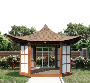 - Универсальность. Подходит и как легкое летнее укрытие, и как утепленная «зимняя» беседка в комплектации со сплошным остеклением.