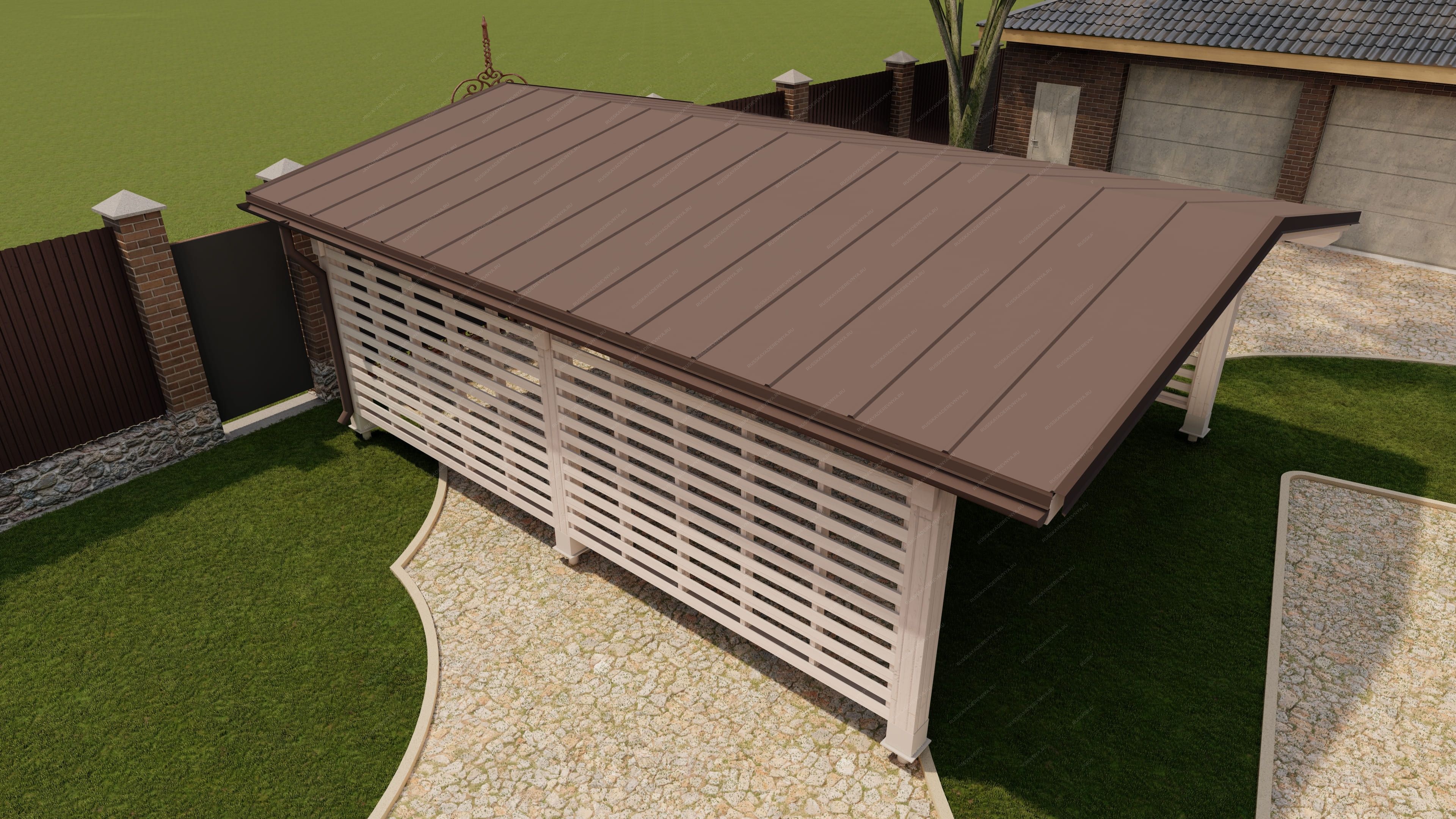 - Металлочерепица отличается высокой прочностью, стойкостью к атмосферным воздействиям и легкостью в установке. Она не только защитит конструкцию от дождя и снега, но и придаст ей стильный и современный вид. Легкий монтаж и большой каталог расцветовк позволят легко вписать конструкцию в общий стиль вашего участка.