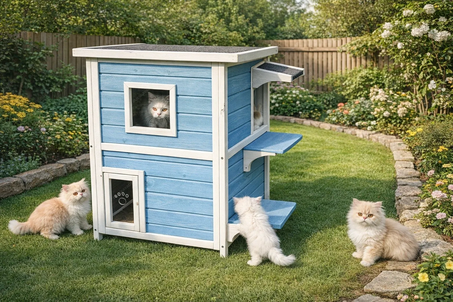 Уличные будки-домики для кошек представляют собой продуманное жилое пространство, созданное для комфортного пребывания питомца на свежем воздухе. Выполненные из натурального дерева, такие сооружения органично вписываются в ландшафт загородного участка, обеспечивая естественную терморегуляцию: летом внутри сохраняется прохлада, а в прохладные дни древесина удерживает тепло, накопленное за световой день. Экологичность материала гарантирует безопасность для здоровья животного, исключая выделение вредных веществ. Архитектура таких домиков часто включает элементы, превращающие обычное укрытие в настоящий кошачий комплекс. Небольшая терраса позволяет питомцу возлежать на солнце, контролируя территорию, а наличие окна даёт возможность наблюдать за происходящим снаружи, оставаясь в укрытии. Лестница, ведущая на второй этаж, превращает будку в многоуровневое пространство для игр и отдыха: верхний ярус кошки нередко используют как наблюдательный пункт или место для уединённого сна, куда не добраться другим животным. Конструкция учитывает природные инстинкты: закрытая нижняя часть служит надёжным убежищем, где можно спрятаться и чувствовать себя в полной безопасности, а открытые элементы стимулируют физическую активность. Качественная обработка древесины и защитные покрытия продлевают срок службы изделия, сохраняя его внешний вид и функциональность в любых погодных условиях. Такой домик становится для кошки не просто будкой, а личным пространством, где можно играть, отдыхать и наблюдать за окружающим миром, находясь в гармонии с природой.