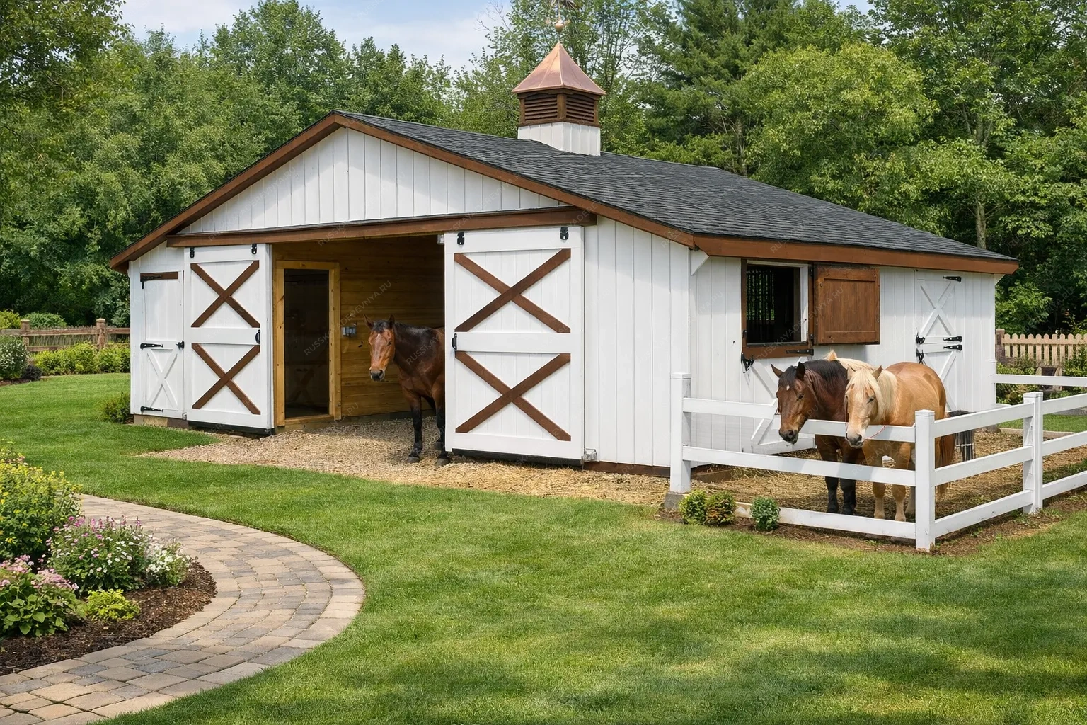 Деревянная конюшня представляет собой оптимальное решение для содержания лошадей, объединяющее надёжность конструкции и комфорт животных. Натуральная древесина создаёт внутри здоровый микроклимат: материал регулирует влажность, обеспечивает естественную вентиляцию и сохраняет тепло в холодное время года, что критически важно для чувствительной дыхательной системы лошадей. Экологичность и отсутствие вредных примесей гарантируют безопасность даже при длительном нахождении животных внутри. Архитектура таких построек продумана с учётом потребностей лошадей и удобства ухода. Конструкция включает закрытую часть — тёплое стойловое помещение для отдыха и защиты от непогоды, а также открытую зону, где животные могут находиться на свежем воздухе под навесом. Это позволяет лошадям самостоятельно выбирать место пребывания в зависимости от погоды и самочувствия. Предусмотрены различные конфигурации в зависимости от задач. Варианты с просторным загоном обеспечивают возможность активного движения и выпаса на огороженной территории. Ограниченные модификации представляют собой компактные решения без выгула либо с минимальной выгульной зоной, что актуально для временного содержания или небольших участков. Качественная древесина, прошедшая камерную сушку и обработку защитными составами, устойчива к биологическим поражениям, влаге и перепадам температур. Отсутствие щелей и гладкая поверхность материалов исключают риск травматизма животных и упрощают санитарную обработку помещений. Внутреннее пространство может быть организовано с учётом размещения кормушек, автопоилок и инвентаря. Такая конюшня становится надёжным домом для лошадей, где соблюдены все условия для их здоровья, безопасности и естественного поведения.