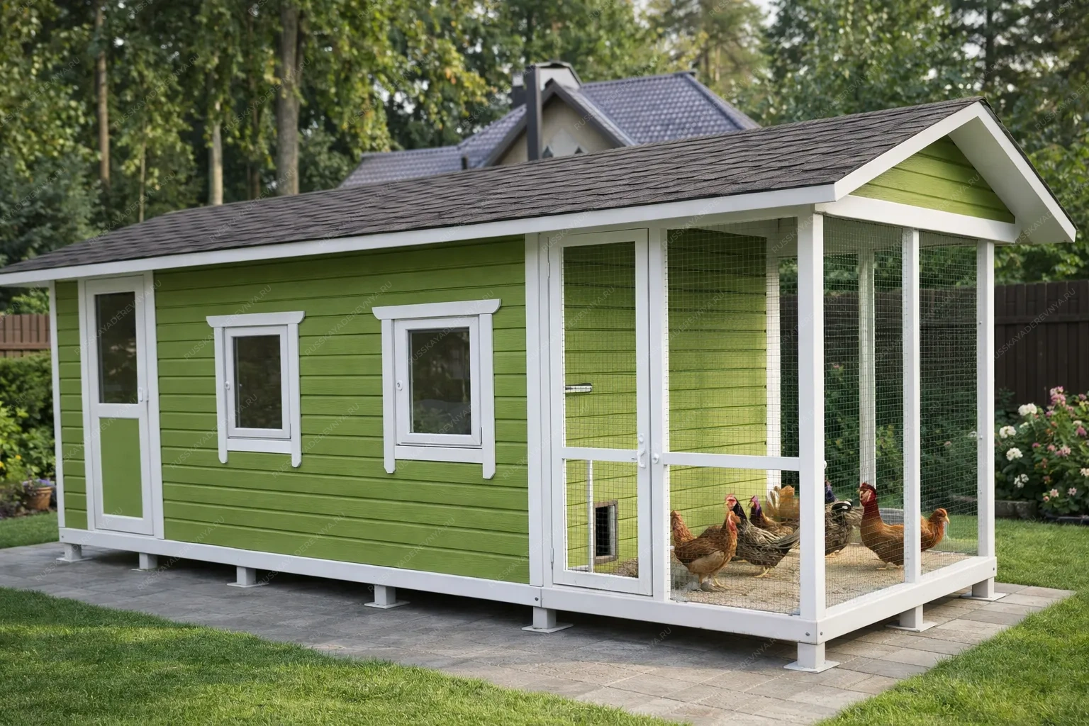 Деревянный курятник — это продуманное жилое пространство для содержания кур, объединяющее комфорт птицы и удобство ухода. Натуральная древесина создаёт внутри здоровый микроклимат: материал эффективно удерживает тепло в холодное время года, не перегревается в летний зной и обеспечивает естественную вентиляцию, что особенно важно для профилактики заболеваний птицы. Экологически чистая основа безопасна для кур любого возраста и исключает вредные испарения. Конструкция традиционно разделена на две функциональные зоны. Закрытая часть представляет собой утеплённый птичник с защитой от сквозняков и осадков, где куры ночуют, несутся и укрываются в непогоду. Здесь уже предусмотрено всё необходимое: удобные насесты для отдыха и гнёзда для кладки яиц, а также кормушки и поилки, размещённые с учётом свободного доступа птицы и простоты наполнения. Открытая ограждённая часть — это просторный выгул с сетчатым ограждением, защищающий поголовье от хищников и позволяющий курам свободно передвигаться, клевать траву и греться на солнце, что напрямую влияет на качество яиц и общее здоровье поголовья. Некоторые модели дополнены небольшим хозблоком для хранения инвентаря, кормов и подстилки. Такое решение позволяет держать всё необходимое под рукой, не загромождая основное помещение и не организуя отдельную постройку на участке. Древесина, прошедшая камерную сушку и обработку защитными составами, устойчива к влаге, перепадам температур и биологическим угрозам. Гладкая поверхность материалов упрощает уборку и дезинфекцию, а продуманная конструкция обеспечивает удобный доступ ко всем зонам. Курятник из дерева становится полноценным комплексом для содержания птицы, где соблюдены все условия для яйценоскости, здоровья и естественного поведения кур, а компактные размеры и природная эстетика позволяют органично вписать постройку в любой участок.