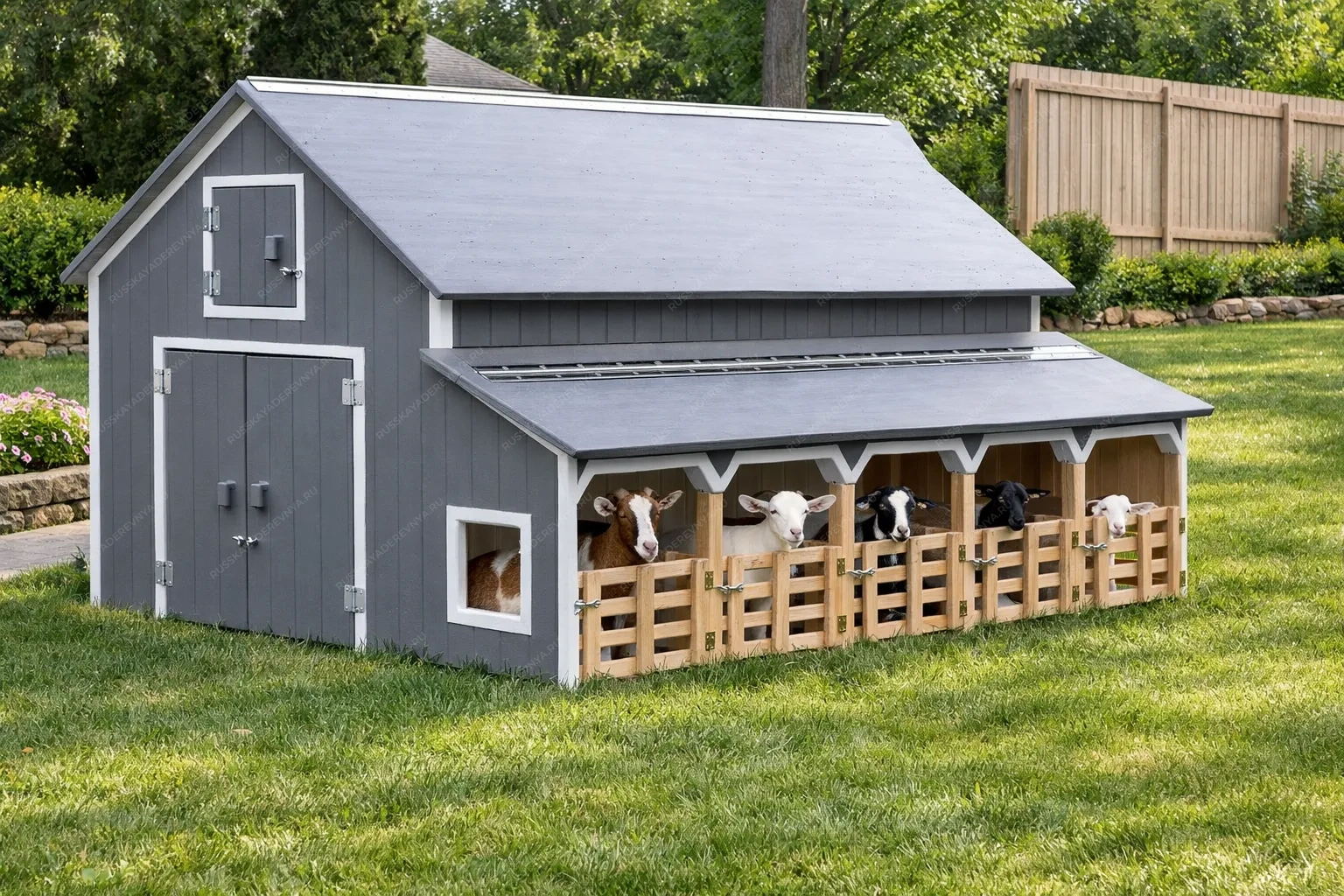 Деревянный козлятник — это специализированная постройка для содержания коз и овец, объединяющая практичность и заботу о животных. Натуральная древесина создаёт оптимальный микроклимат внутри: она сохраняет тепло зимой и обеспечивает естественную вентиляцию в жаркие дни, что особенно важно для здоровья мелкого рогатого скота. Экологически чистый материал исключает вредные испарения, а гладкая поверхность обработанной доски упрощает уборку и дезинфекцию помещения. Конструктивно такое сооружение часто представляет собой хозблок или сарай, дополненный открытой или закрытой террасой. Основное помещение служит для ночлега и защиты от непогоды, а примыкающая терраса становится удобным местом для кормления или дневного отдыха животных на свежем воздухе. Наличие ограждения по периметру позволяет организовать безопасный выгул, не опасаясь, что козы или овцы разбредутся по участку. В других вариантах исполнения терраса остаётся открытой, что даёт животным больше свободы и доступа к солнцу. Продуманная планировка включает зоны для размещения кормушек, поилок и хранения инвентаря. Древесина, прошедшая камерную сушку и обработку защитными составами, устойчива к влаге, перепадам температур и биологическим угрозам, что гарантирует долговечность постройки даже при интенсивной эксплуатации. Козлятник из дерева становится не просто укрытием, а полноценным комплексом для содержания скота, где каждая деталь подчинена удобству ухода и комфорту животных.