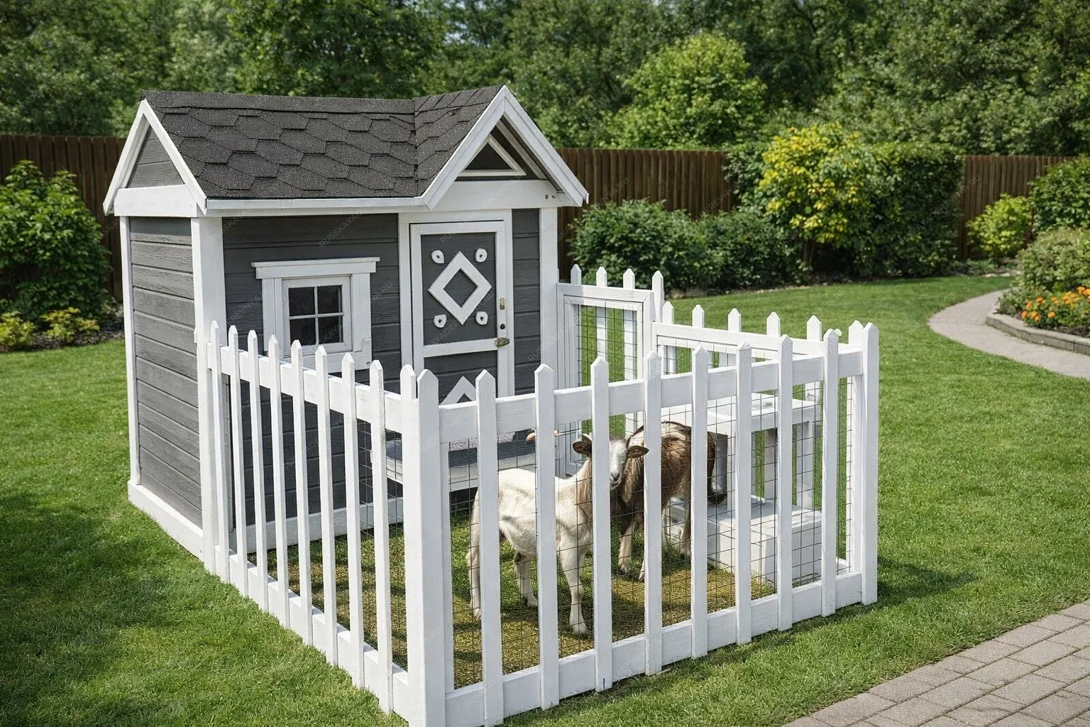 Деревянный козлятник — это специализированная постройка для содержания коз и овец, объединяющая практичность и заботу о животных. Натуральная древесина создаёт оптимальный микроклимат внутри: она сохраняет тепло зимой и обеспечивает естественную вентиляцию в жаркие дни, что особенно важно для здоровья мелкого рогатого скота. Экологически чистый материал исключает вредные испарения, а гладкая поверхность обработанной доски упрощает уборку и дезинфекцию помещения. Конструктивно такое сооружение часто представляет собой хозблок или сарай, дополненный открытой или закрытой террасой. Основное помещение служит для ночлега и защиты от непогоды, а примыкающая терраса становится удобным местом для кормления или дневного отдыха животных на свежем воздухе. Наличие ограждения по периметру позволяет организовать безопасный выгул, не опасаясь, что козы или овцы разбредутся по участку. В других вариантах исполнения терраса остаётся открытой, что даёт животным больше свободы и доступа к солнцу. Продуманная планировка включает зоны для размещения кормушек, поилок и хранения инвентаря. Древесина, прошедшая камерную сушку и обработку защитными составами, устойчива к влаге, перепадам температур и биологическим угрозам, что гарантирует долговечность постройки даже при интенсивной эксплуатации. Козлятник из дерева становится не просто укрытием, а полноценным комплексом для содержания скота, где каждая деталь подчинена удобству ухода и комфорту животных.