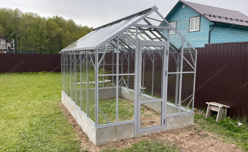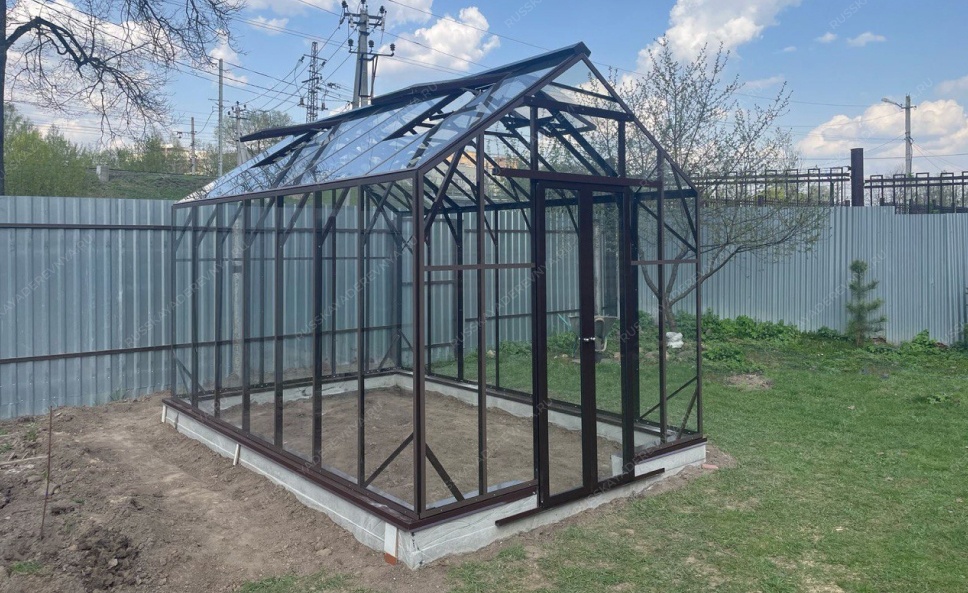 Теплица зарекомендовавшая себя на рынке уже не первый год, пользуется постоянным спросом среди дачников любителей, а так же садовников профессионалов. Пятое поколение теплиц «Удача», с инновационной и уникальной системой дверей и фрамуг. Основной каркас из алюминиевых уголков АД 31Т1 40х40х3 мм., каркас фасада выполнен из алюминиевых профильных труб. Высота боковой стенки 1500 мм., высота в коньке 2500 мм. Стекло М1 толщиной 4 мм. Для крепления стекла применяется, специальный морозо- и жароустойчивый пластиковый профиль. Фрамуги из монолитного прозрачного поликарбоната, толщиной 2 мм. Дверь из профиля «Проведал». Каркас не крашеный! Покраска — это дополнительная опция. Теплица окрашивается порошковой краской, Ral 8017 (шоколадно коричневый), и Ral 7040 (серый) цвет. Для теплиц необходим фундамент. Мы предлагаем несколько вариантов фундамента для теплиц:фундамент из бруса и бетонно-ленточный фундамент.
