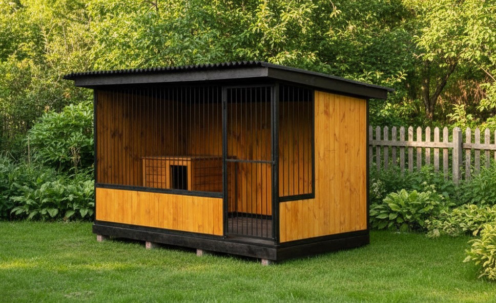 Верхняя панель, нижняя панель 2-3 доски с дверью, поворотная кормушка на 2 миски.