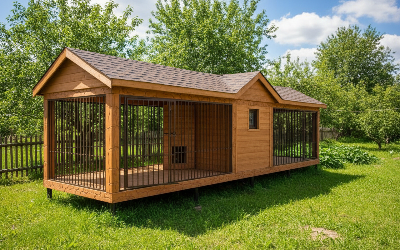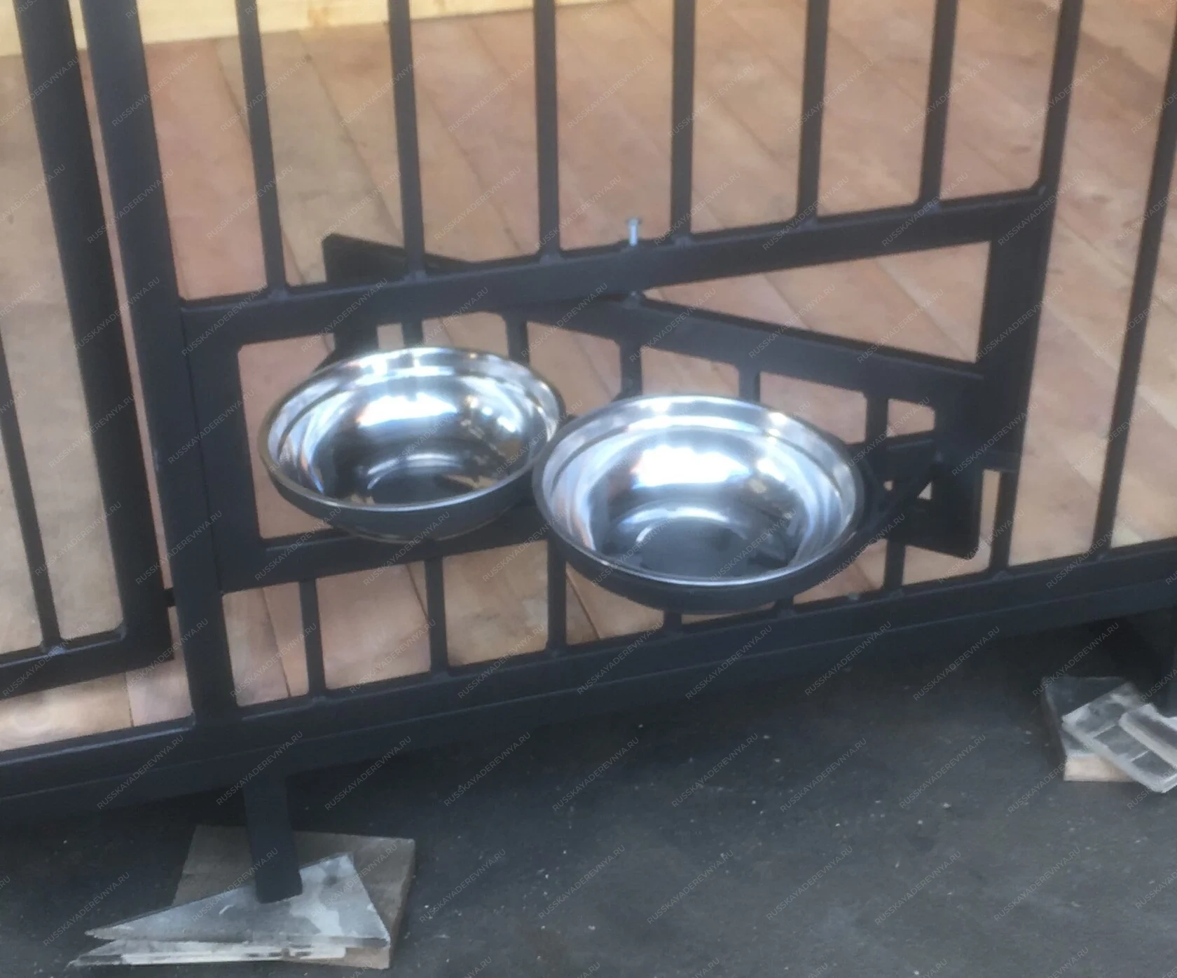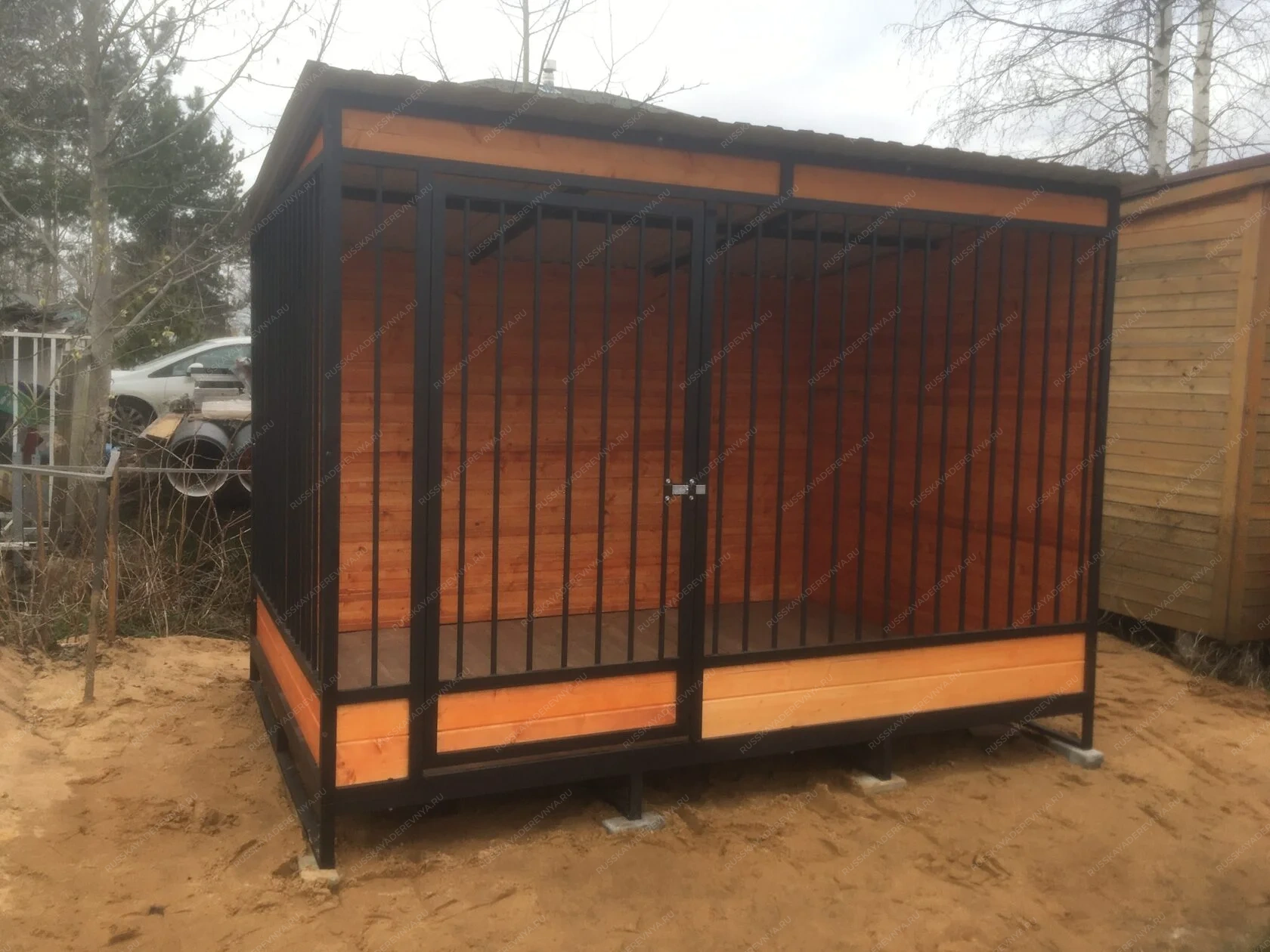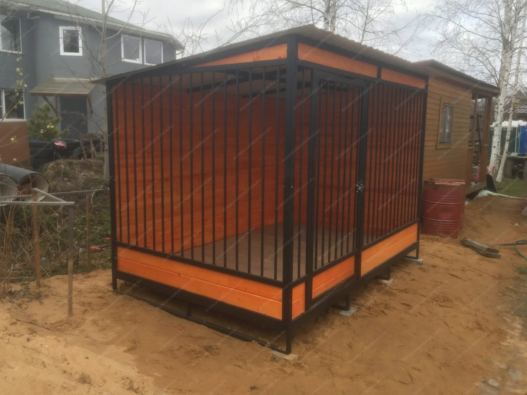 Мы изготавливаем вольеры по особой технологии, придуманной нами и проверенной временем. Установить изделие можно на любую поверхность, под него не нужен фундамент. Мы не ставим вольеры на блоки, поэтому наши вольеры выглядят стильно и аккуратно и не портят ландшафт. Крыша способна выдержать 250кг/м2 - не провалится под слоем снега. Решетка не погнется под натиском даже очень сильной собаки. Стенки очень крепкие - процарапать когтями дыру, сгрызть или пробить своим телом(как в вольерах из ОСБ фанеры, евровагонки или доски 25х100мм) не смогут собаки даже самых крупных пород. Можно выбрать расположение двери (справа или слева), а также направление открытия двери (наружу или внутрь). При заказе хозблока тоже можно выбрать его расположение (справа или слева). Уточняйте при согласовании заказа.