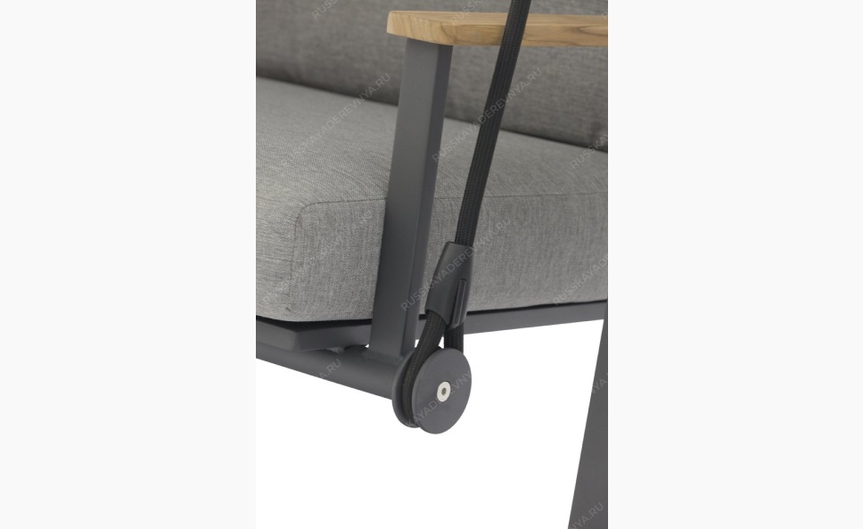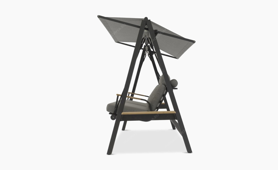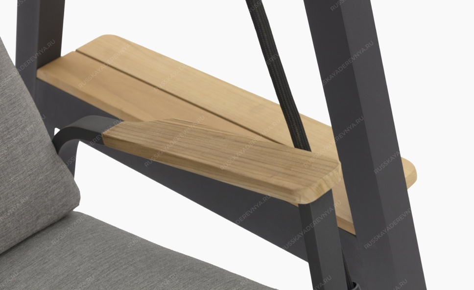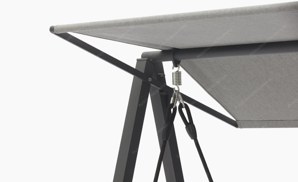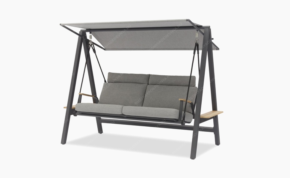 Веревки крепятся к пружинам, чтобы создать дополнительный комфорт сидения. Тент может быть установлен в 2-х разных положениях. Боковой столик из тикового дерева с обеих сторон качелей. Высокая спинка создает отличный комфорт и прекрасную поддержку головы. Алюминиевые диски, изготовленные по специальному заказу, имеют пластиковый элемент фиксации, удерживающий веревку в идеальном положении для оптимального качания. Очень удобные подушки из пенопласта с высокой эластичностью и покрытые олефиновой тканью с подкладкой, которая делает их водоотталкивающими.