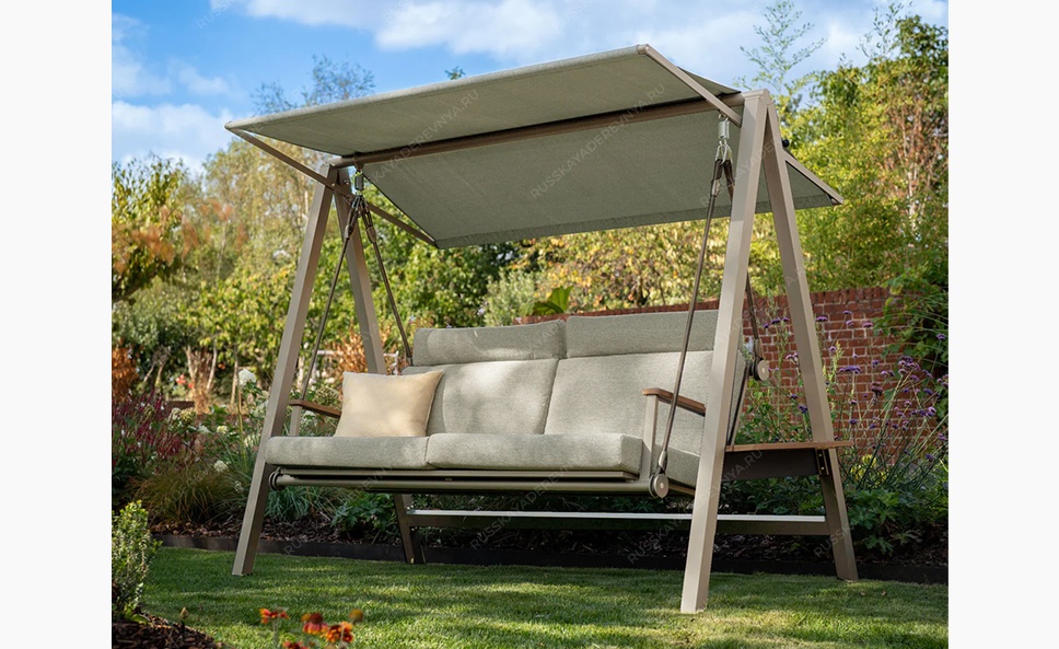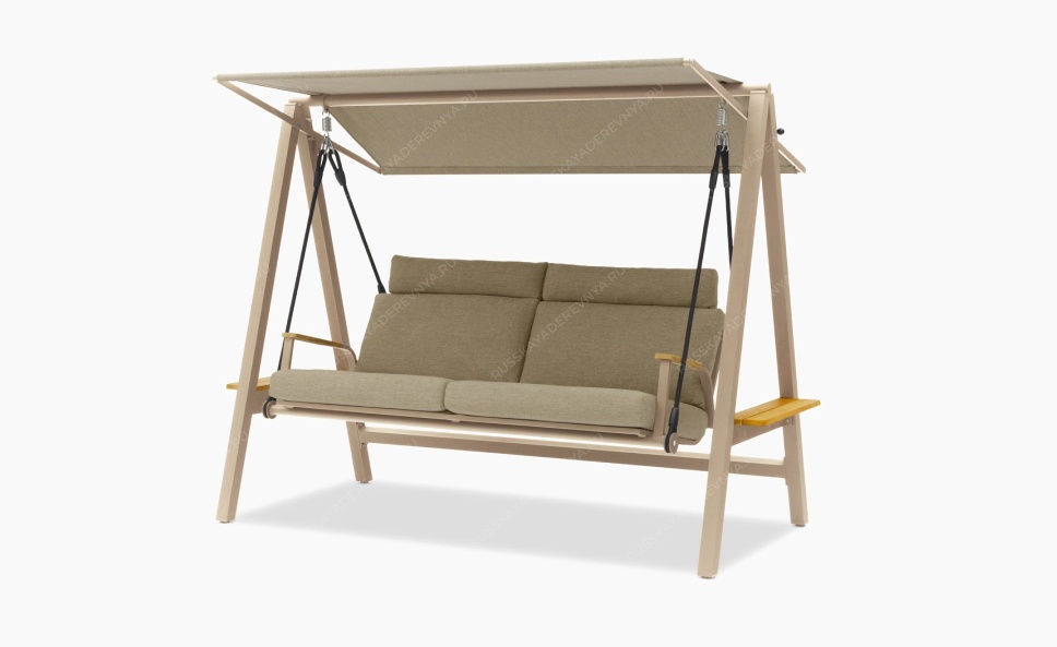 Веревки крепятся к пружинам, чтобы создать дополнительный комфорт сидения. Тент может быть установлен в 2-х разных положениях. Боковой столик из тикового дерева с обеих сторон качелей. Высокая спинка создает отличный комфорт и прекрасную поддержку головы. Алюминиевые диски, изготовленные по специальному заказу, имеют пластиковый элемент фиксации, удерживающий веревку в идеальном положении для оптимального качания. Очень удобные подушки из пенопласта с высокой эластичностью и покрытые олефиновой тканью с подкладкой, которая делает их водоотталкивающими.