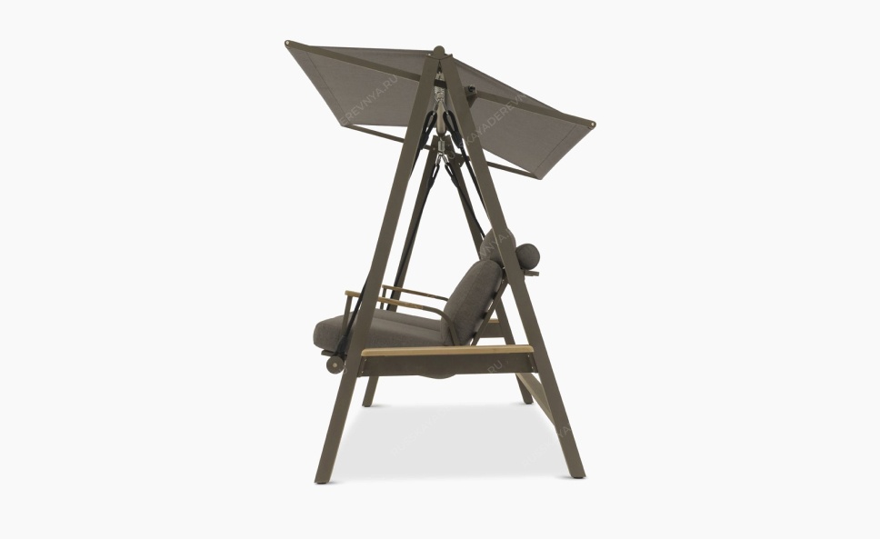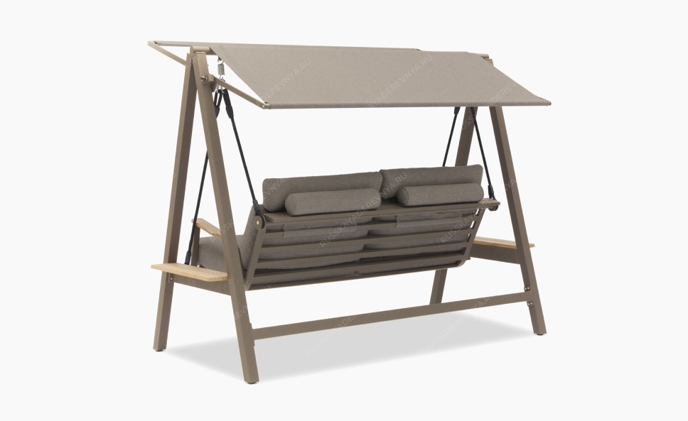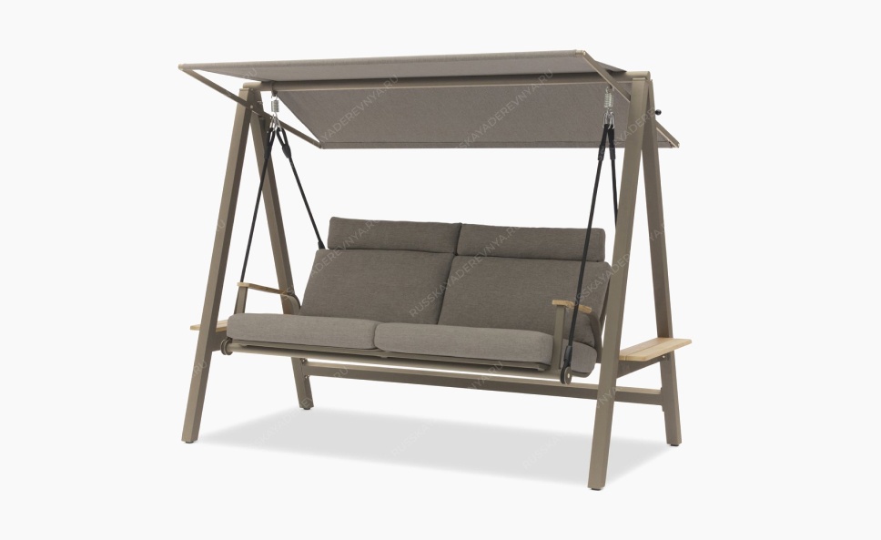Удобные и качественные качели из алюминия — идеальный выбор для вашего участка. Веревки крепятся к пружинам, чтобы создать дополнительный комфорт сидения. Тент может быть установлен в 2-х разных положениях. Боковой столик из тикового дерева с обеих сторон качелей. Высокая спинка создает отличный комфорт и прекрасную поддержку головы. Алюминиевые диски, изготовленные по специальному заказу, имеют пластиковый элемент фиксации, удерживающий веревку в идеальном положении для оптимального качания. Очень удобные подушки из пенопласта с высокой эластичностью и покрытые олефиновой тканью с подкладкой, которая делает их водоотталкивающими.
