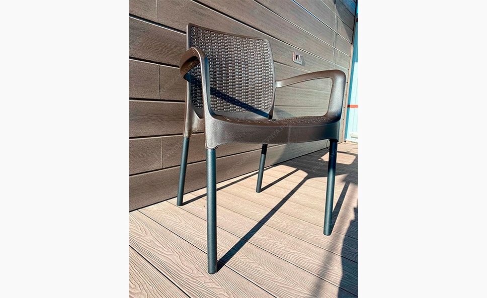 Комплект пластиковой мебели Bali Set Комплект от российского производителя Gardeck включает 6 стульев с подлокотниками, металлическими ножками и 1 обеденный стол, идеально подойдёт для оформления садового участка, позволяет с комфортом разместиться Вам и Вашим гостям на террасе или балконе в количестве 6 человек. Преимущества обеденной группы Bali Set Стопируемые стулья Разборные ножки у стола 2 металлических усилителя для стола Стильный, современный внешний вид. 100% имитация искусственного ротанга. Высокопрочный и долговечный пластик. Не боится дождя, снега и разрушающих солнечных лучей. Простой уход - мебель моется обычной водой, не впитывает грязь. Преимущества стульев с металлическими ножками: Подходит для частного и коммерческого использования UF-защита: защита от выцветания и долговечность Не впитывает грязь и легко моется водой: простота ухода Разборная конструкция: удобство перевозки Штабелируемость: экономия места при хранении Металлические ножки: устойчивость к высоким нагрузкам Цвет сидения: венге Цвет ножек: черный