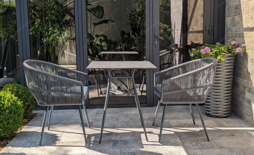 Комплект плетеной мебели РИЦА выполнены в современном стиле каркас из алюминия, окрашенного порошковой краской, так же кресло вручную оплетено полимерным шнуром (роупом). Столешница из HPL – высокопрочного композитного материала, диаметр 65 см. Небольшая полочка-подстолье очень удобна, если надо положить небольшую сумочку или мобильный телефон. Отлично подойдет для летних площадок кафе и ресторанов, т.к. сочетается с любым типом стульев и кресел.