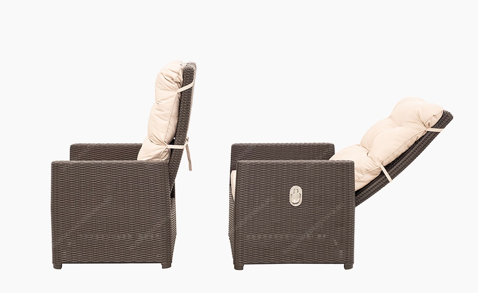 Премиальная итальянская мебель для сада и уличных кафе MANCHESTER SET 2 от итальянского производителя B:Rattan, включает два кресла-шезлонга и столик. Пластиковый комплект порадует любителей плетеной мебели своей фактурой в стиле ротанг и прочностью: максимальная до 150 кг. Регулируемый наклон спинки: от 30 до 90° к горизонтали, может быть зафиксирован в любом промежуточном положении. Мягкие подушки в комплекте (толщина верхних подушек 15 см, нижних — 8,5 см). Не требует сборки. Параметры посадочного места: высота 44,5 см, ширина 54 см, глубина (до подушки) 50 см. Вся мебель B:Rattan идеальна для открытых площадок и закрытых помещений, подходит для коммерческого использования, отлично гармонирует с интерьерами: ресторанов; офисов; луанж-зон; холлов отелей; открытых террас; веранд; коттеджей; загородных домов; зон возле бассейна; дачных участков. Преимущества коллекции итальянской уличной мебели Многофункциональность Регулируемый наклон спинки позволяет трансформировать кресло в шезлонг. Благодаря этому один комплект мебели можно использовать для принципиально разного отдыха на улице. Эргономичность Объемные подушки, откидывающиеся спинки, подлокотники обеспечивают непревзойденный уровень комфорта. Простой уход Практичный и легкий материал под ротанг не требует специального ухода, легко очищается водой и мылом. Съемные чехлы на подушках (кроме подушки под спину) делают уход еще более простым. Эстетичность Стильный сет из двух кресел-шезлонгов с кофейным столиком добавит европейского шика экстерьеру. Долговечность Отсутствие металлических элементов обеспечивает легкость комплекта и исключает вероятность коррозии его элементов. Устойчив к ультрафиолету.