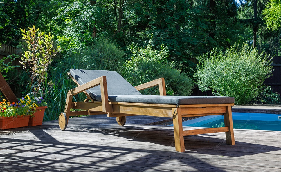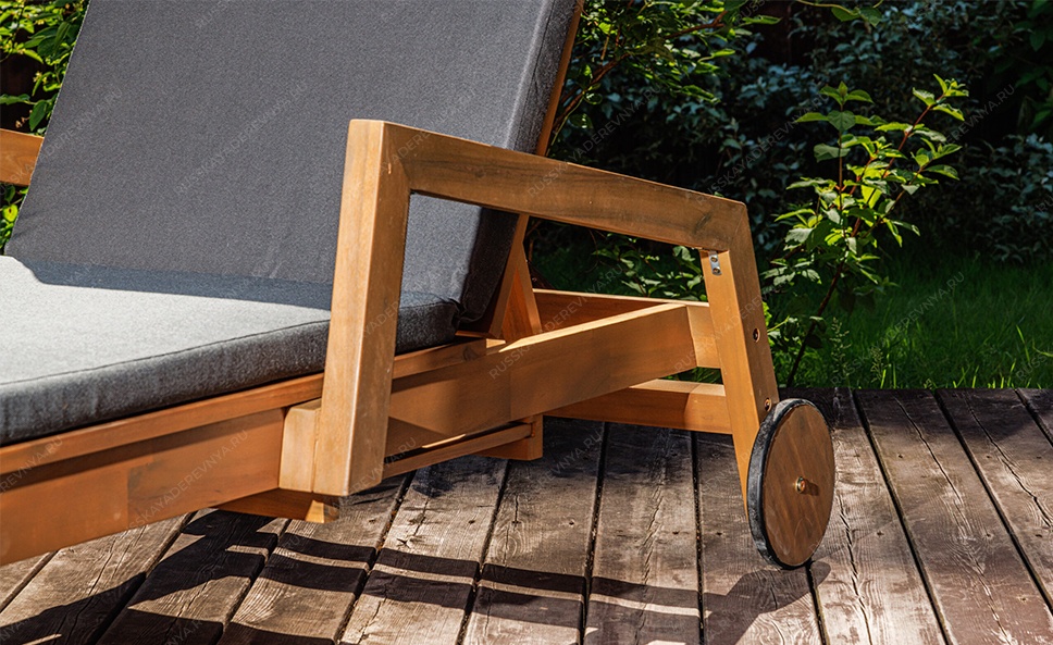 Шезлонги выполнены из натурального дерева акации (teaklook). – Удобный плотный матрас надежно закрепляется на шезлонге – Съемные водоотталкивающие чехлы сделают ваш отдых по-настоящему комфортным – Регулируемая спинка и колесики для легкого передвижения прослужат вам долгие годы